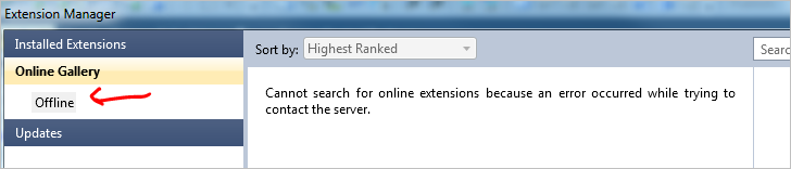 While attempting to update to the recently released 1.6 version of Nuget at work, a few of us were having trouble connecting to the Online Extension Gallery in Visual Studio. As you can see in the following image, the Online Gallery was listed as being 'Offline'.