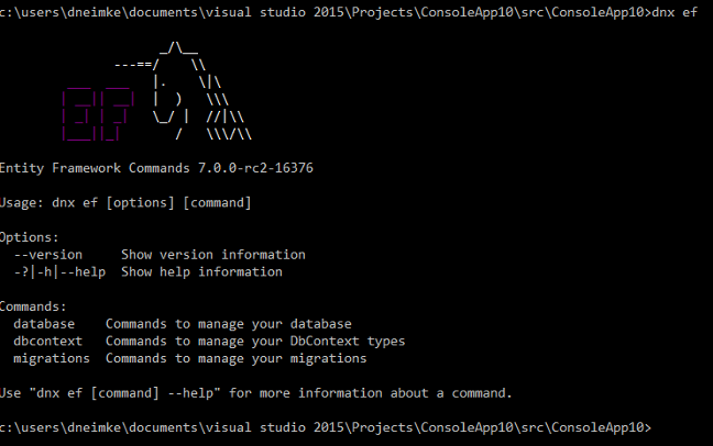 At this point, EF7 is configured and available to use. To test this, jump to the command line at the root of your project and type dnx ef. You should see the Magic Unicorn splash screen.