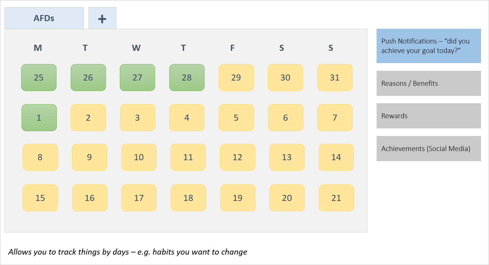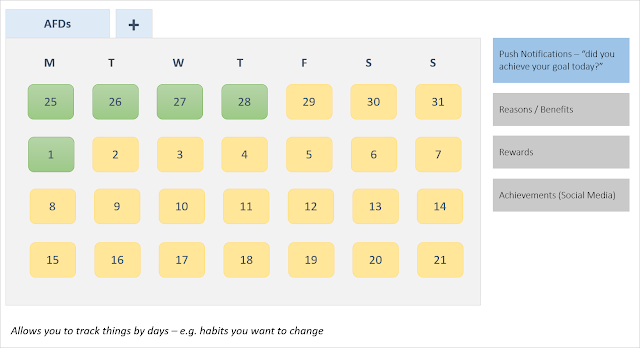 The Habit Kicker application let's you create a habit that you want to kick - in my case, I am aiming to have alcohol free days (AFD's) and then record success outcomes. The system will push out an alert asking for feedback about whether you have achieved your goal for the day.